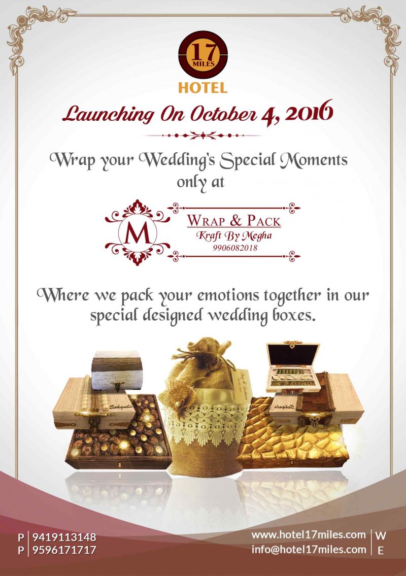 Hotel 17 miles launches Designer Wedding’s Boxes Kraft by Megha on 4th October 2016. With customized wedding boxes we will increase your happiness and excitement of wedding celebrations.