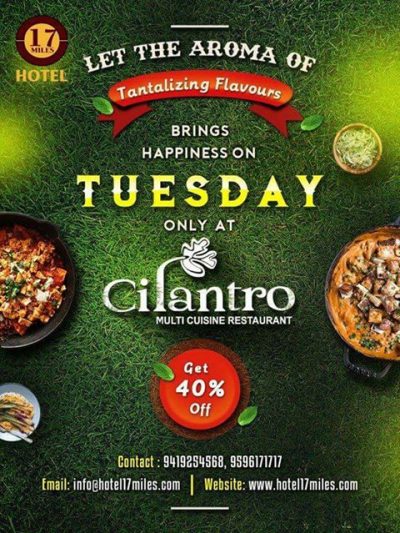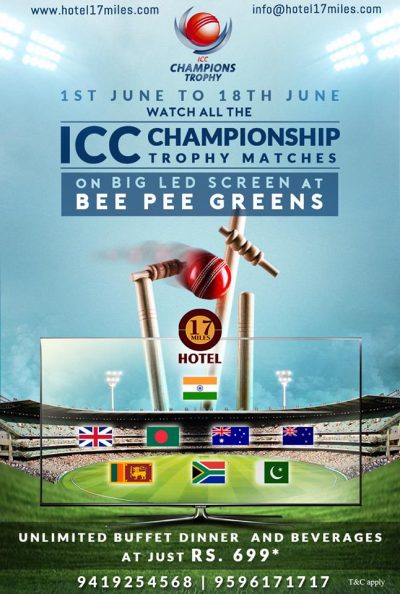 Watch all the ICC Champions Trophy matches Live on Big LED screen at Bee Pee Greens, Hotel17miles from 1st June to 18th June, 2017 Enjoy unlimited buffet Dinner and beverages for just Rs 699 + taxes. For more information call us at 9419254568, 9596171717 T&C Apply